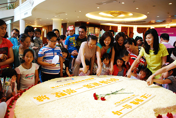 10時許,等待已久的時刻終于到了。“下面我們將邀請幾對母子一起來切蛋糕。”主持人的話音剛落,便有母親領著小孩舉手報名了,幾對母子一起切出“第一刀”。隨著這“第一刀”下去,蛋糕特有的香甜味便在營銷中心內彌漫開來,挑撥著人們的食欲。一邊等待的小朋友,饞得直咽口水;而拿到蛋糕的小朋友,則不顧形象地在媒體的鏡頭前大快朵頤,可愛的吃相令人捧腹。