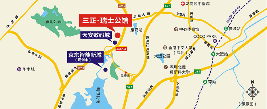 從三正瑞士公館出發,南行500米即是博深高速公路入口,通過高速公路網可順暢抵達深圳福田、羅湖等區。如果轉入龍鳳路、如意路,距離深圳大運新城僅僅3公里,直享大運新城核心區、國際大學城等社會資源優勢,占據鳳崗、龍崗兩個天安數碼城的高精尖人才高地,極具升值潛力。