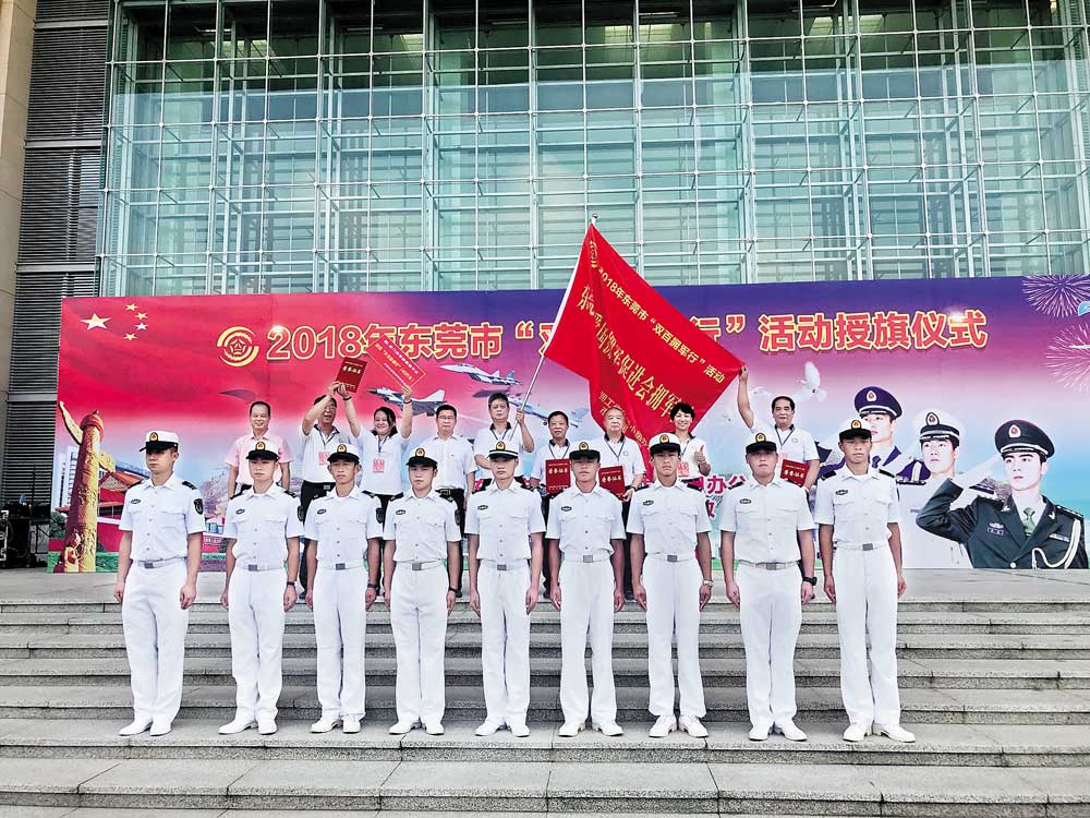 2018年9月5日上午,2018年東莞市“雙百擁軍行”活動授旗儀式在東莞市會議大廈西門廣場舉行?!半p百擁軍行”擁軍團代表、駐莞部隊官兵代表等約240人參加活動。